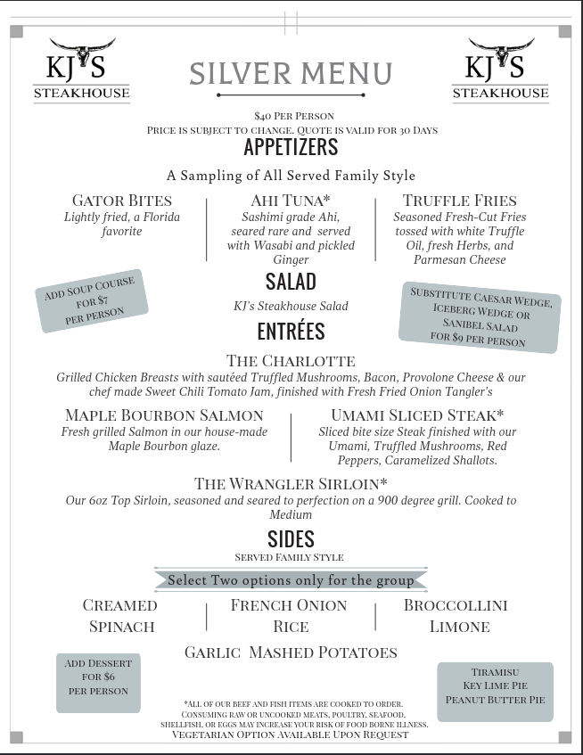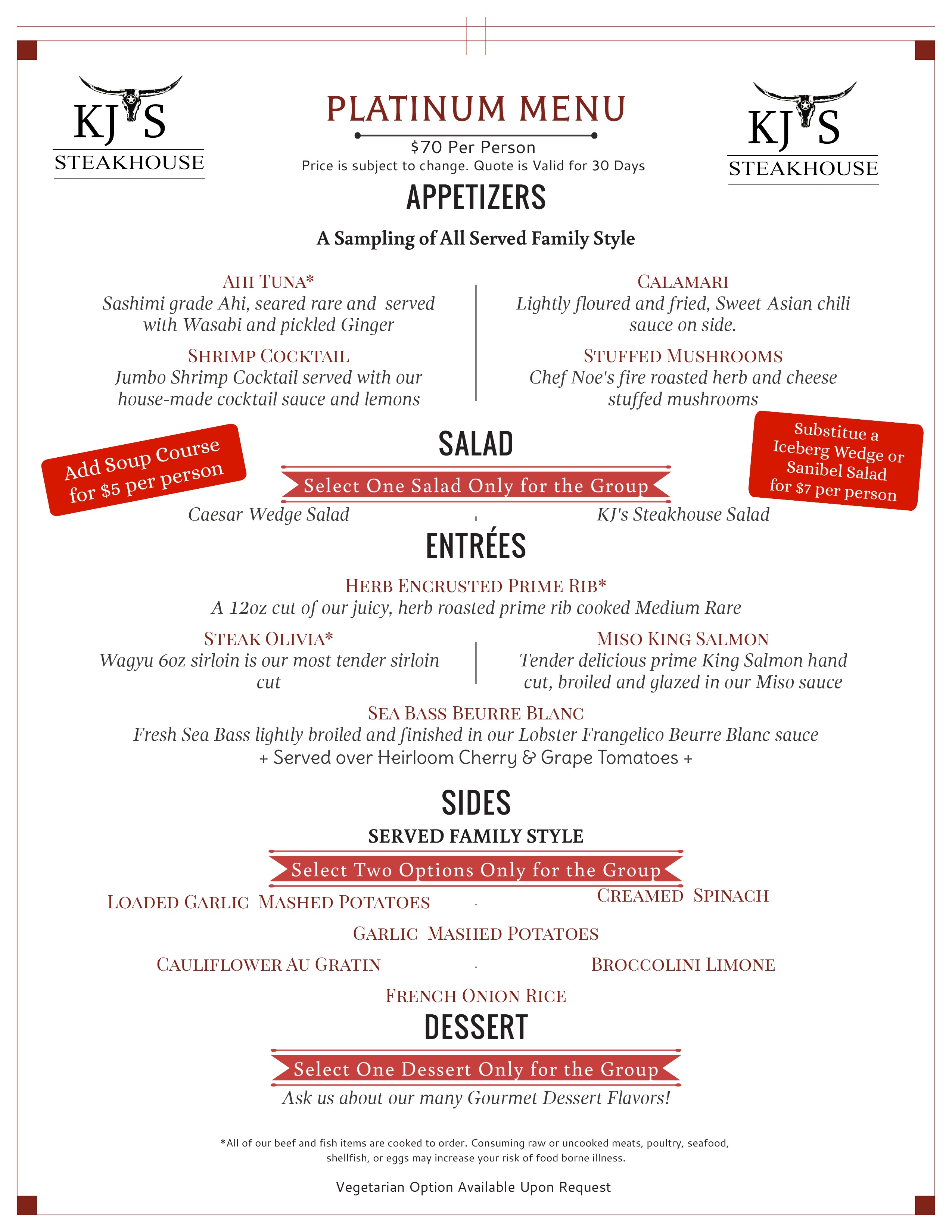 A 3 course meal featuring Wrangler Sirloin and the Balsamic Herb Infused Chicken along with other house favorites.