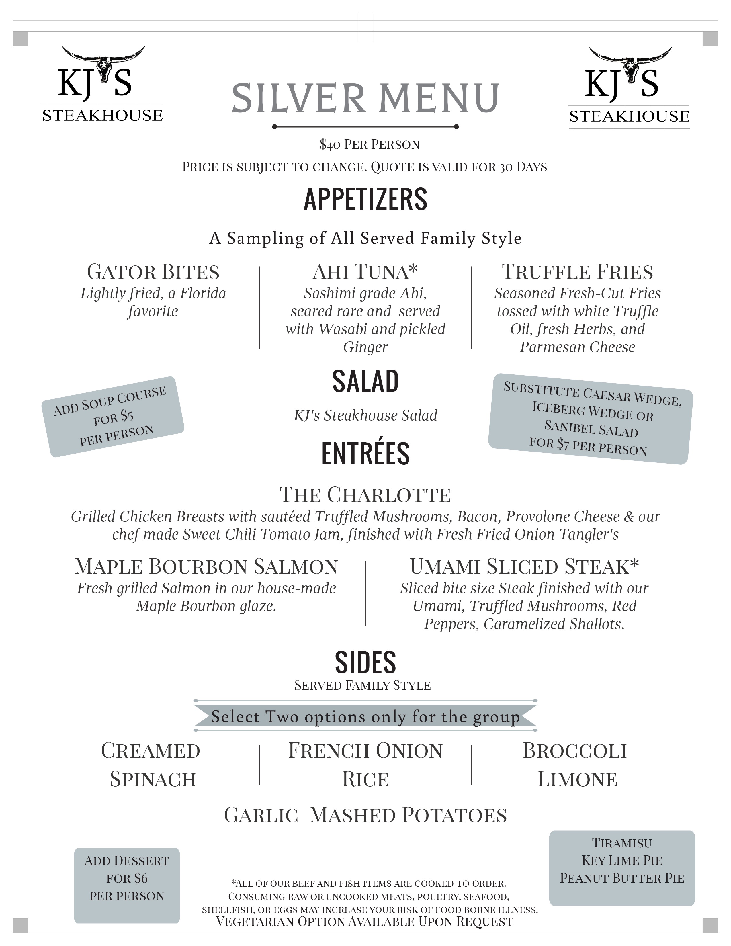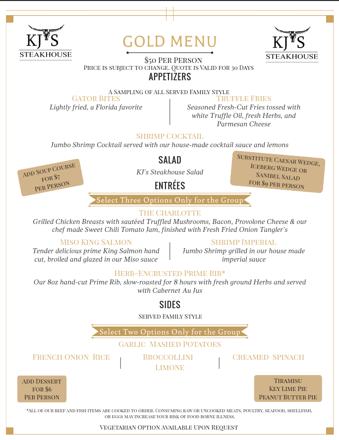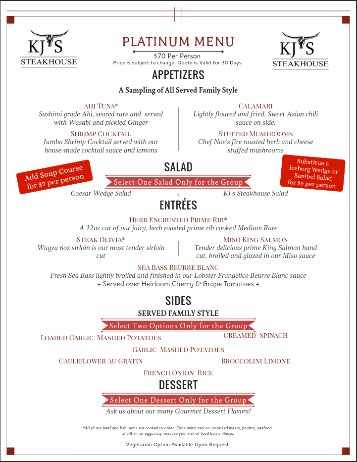 A 3 course meal featuring Herb Encrusted Prime Rib and Shrimp Imperial along with many other house favorites